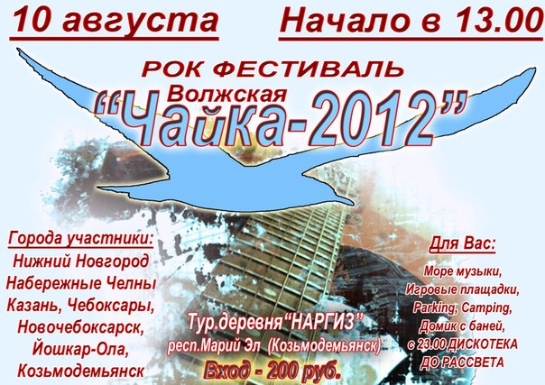 10 августа на территории турбазы «Наргиз» (Козьмодемьянск, Марий Эл) рок-фестиваль «Чайка-2012» 10 августа, в пятницу, на территории (Козьмодемьянск, Марий Эл) рок-фестиваль «Чайка-2012».
